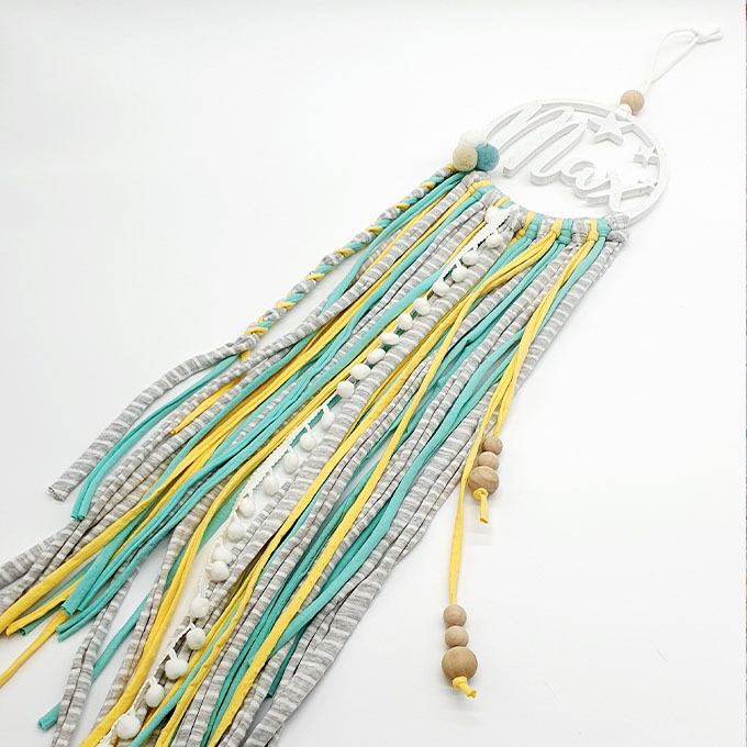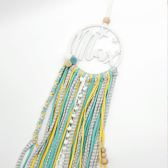 Atrapasueños personalizado realizado con impresión 3D, decorado con cintas de trapillo y detalles en madera natural. Se puede elegir entre gran variedad de colores para la impresión del nombre y la tonalidad para la decoración de trapillo.